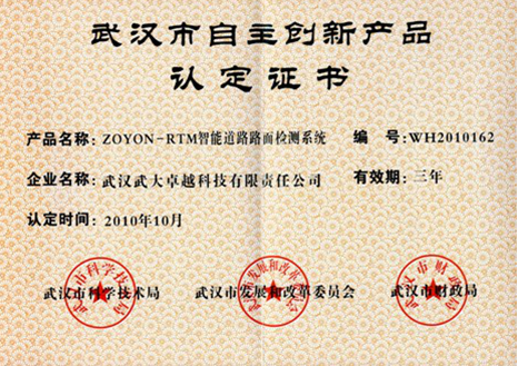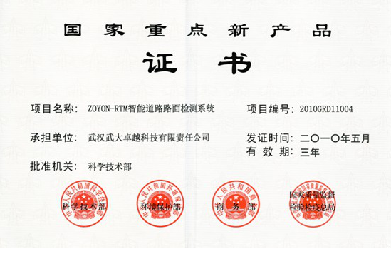 ?武漢武大卓越科技有限責(zé)任公司(以下簡(jiǎn)稱“卓越科技”)的主打產(chǎn)品——ZOYON-RTM智能道路路面檢測(cè)系統(tǒng)(簡(jiǎn)稱RTM道檢系統(tǒng))榮獲國(guó)家科技部授予的“2010年國(guó)家重點(diǎn)新產(chǎn)品”光榮稱號(hào)!2011年1月11日武漢市科技局組織武漢市十大科技專項(xiàng)推進(jìn)工作表彰大會(huì)進(jìn)行了頒獎(jiǎng)、授牌!
