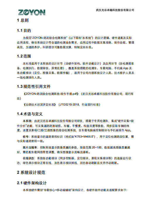 當(dāng)?shù)缆凡『ψR別需精準(zhǔn)到毫米級、設(shè)施巡查要覆蓋全路段、檢測數(shù)據(jù)需支撐科研與養(yǎng)護(hù)決策 ——“ZOYON - 路況綜合檢測系統(tǒng)標(biāo)準(zhǔn)” 應(yīng)需而生。?