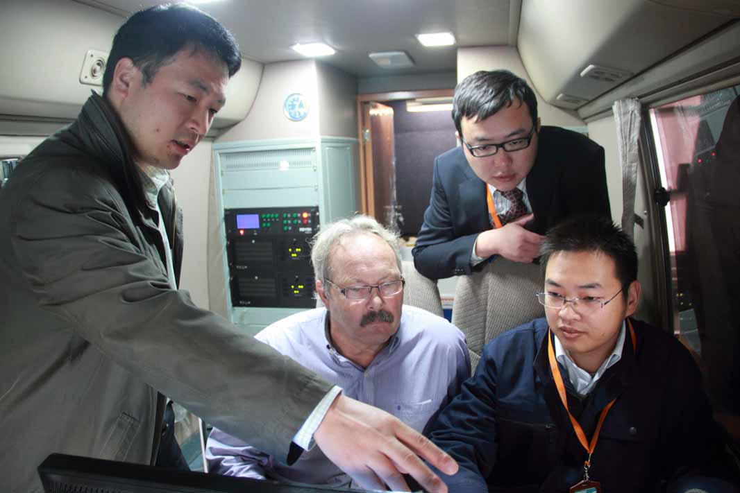 圖為卓越科技毛慶洲博士向邁克教授解說智能道路檢測(cè)車設(shè)備演示